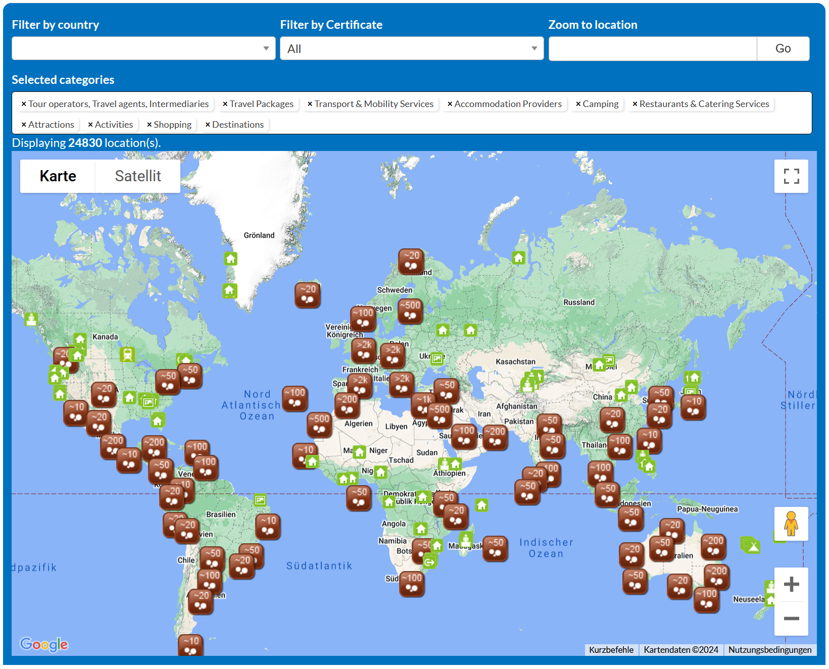 Many "green", "responsible", "sustainable", "ecological" information, marketing and booking services are committed to raise the market share of sustainable and responsible tourism. The Tourism2030 Market Place provides transparency and gives you access to about 100 certification programs on the Global Certification Quickfinder and to more than 20,000 certified businesses, destinations and tour operators on the global Travel Green Planet Maps - all linked to their certificate's profile. The independent Travel Green Maps are used by Marketing and Booking Services